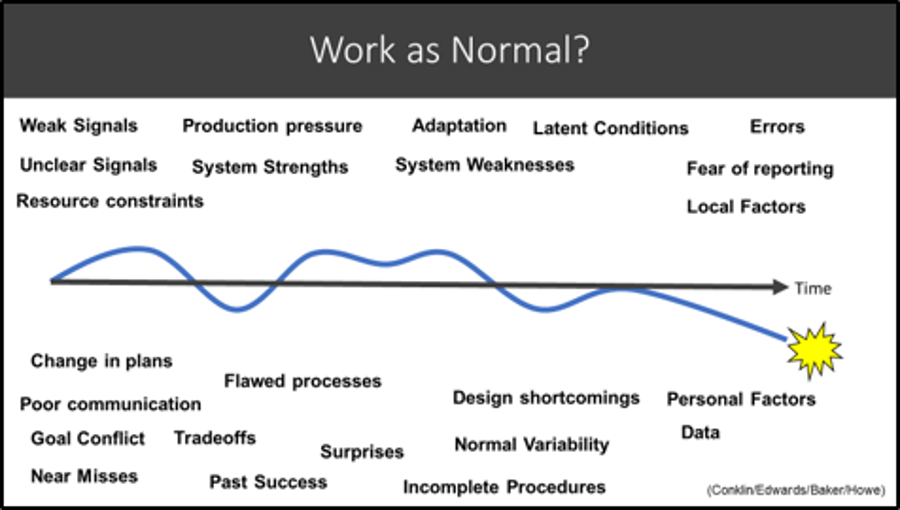 The analysis aims to identify the differences between Work-As-Intended, Work-As-Normal and Work-As-Happened. These conditions contribute to those differences and the impact the differences resulted in.